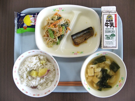 今日の給食は「いも名月メニュー」で、献立は、さつまいもごはん、サンマの梅煮、キャベツのゴマ和え、豆腐のみそ汁、お月見大福、牛乳でした。さつまいもごはんは、ふわっとさつまいもの香りがして、甘みもあり、とても味わい深かったです。ゴマ和えにはたくさんの種類の野菜が入っており、栄養満点でした。そして、お月見をイメージしたデザートも付きました。おいしそうに笑顔で食べる子どもたちの表情が浮かんできました。給食にはいろいろな食材が使われています。収穫への感謝の気持ちをもちながら、今日もおいしくいただきました。