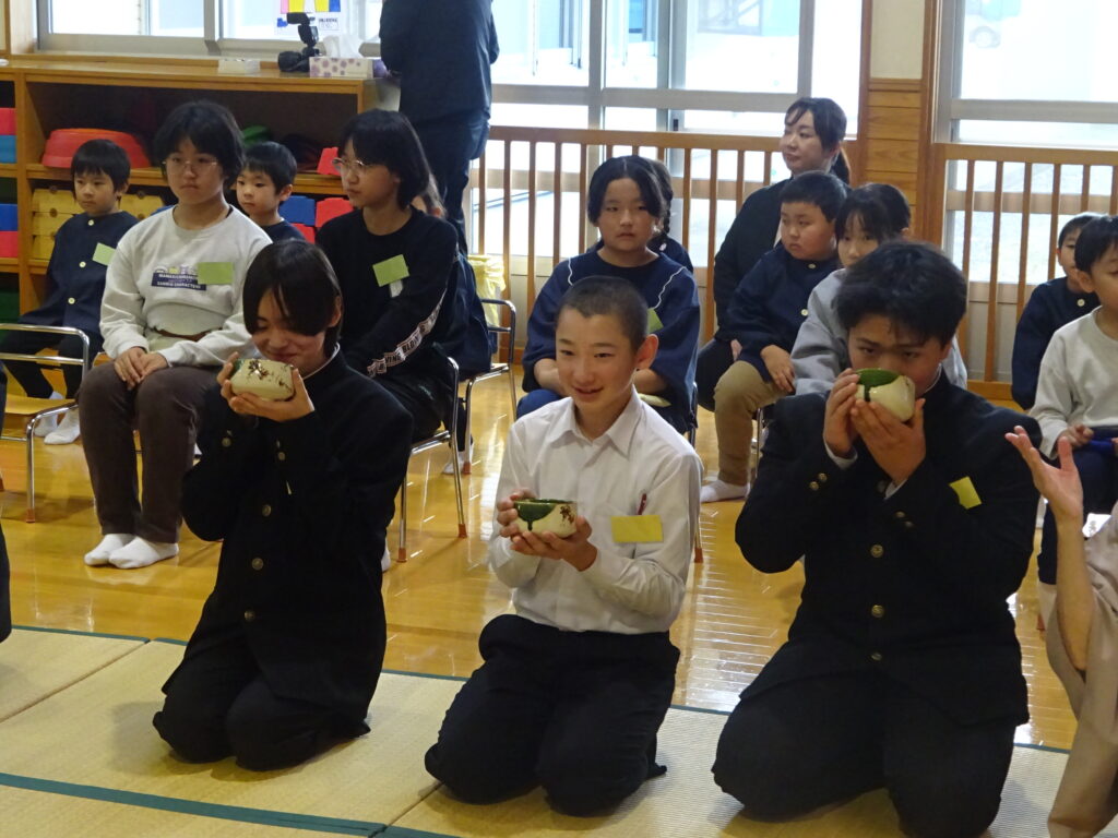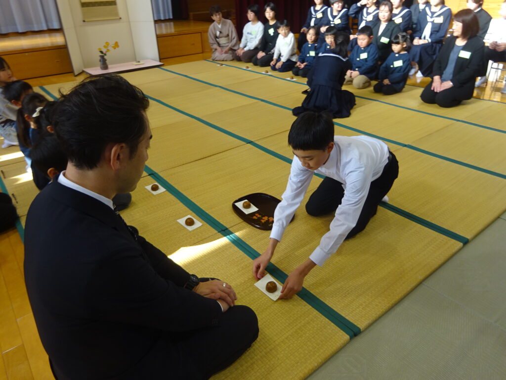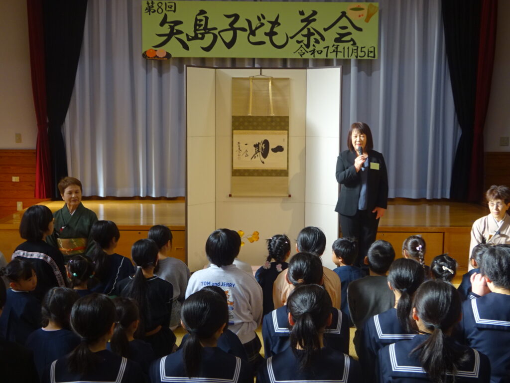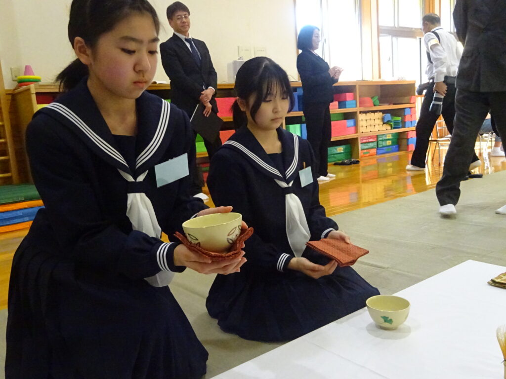 第8回矢島こども茶会が5日(水)に行われました。この会は平成26年から行われていましたが、コロナ禍でしばらく中止していました。今年度より、矢島教育研究会の事業として、幼小中高連携をねらいに、矢島保育園を会場に再開されました。中学校からは、1年生が参加し、70名程度の茶会となりました。普段は、保育園・小学校は裏千家、中学校・高等学校は遠州流で活動していますが、この日は流派を越え仲良くお茶をいただくことができました。また、茶会を通して、相手を思いやるやさしい心を育むことができたと思います。