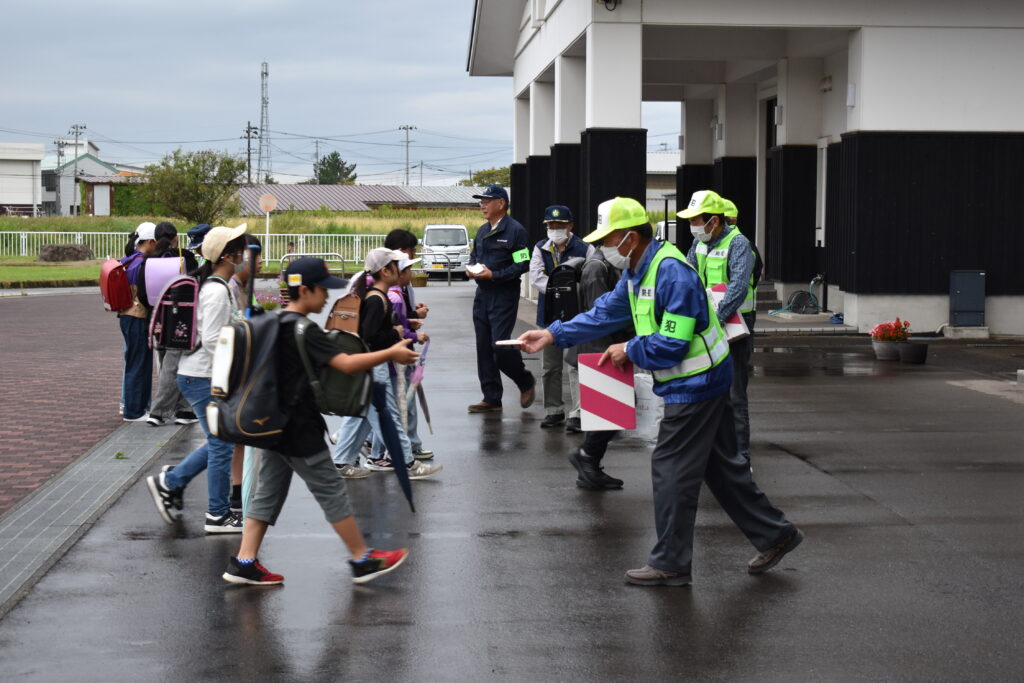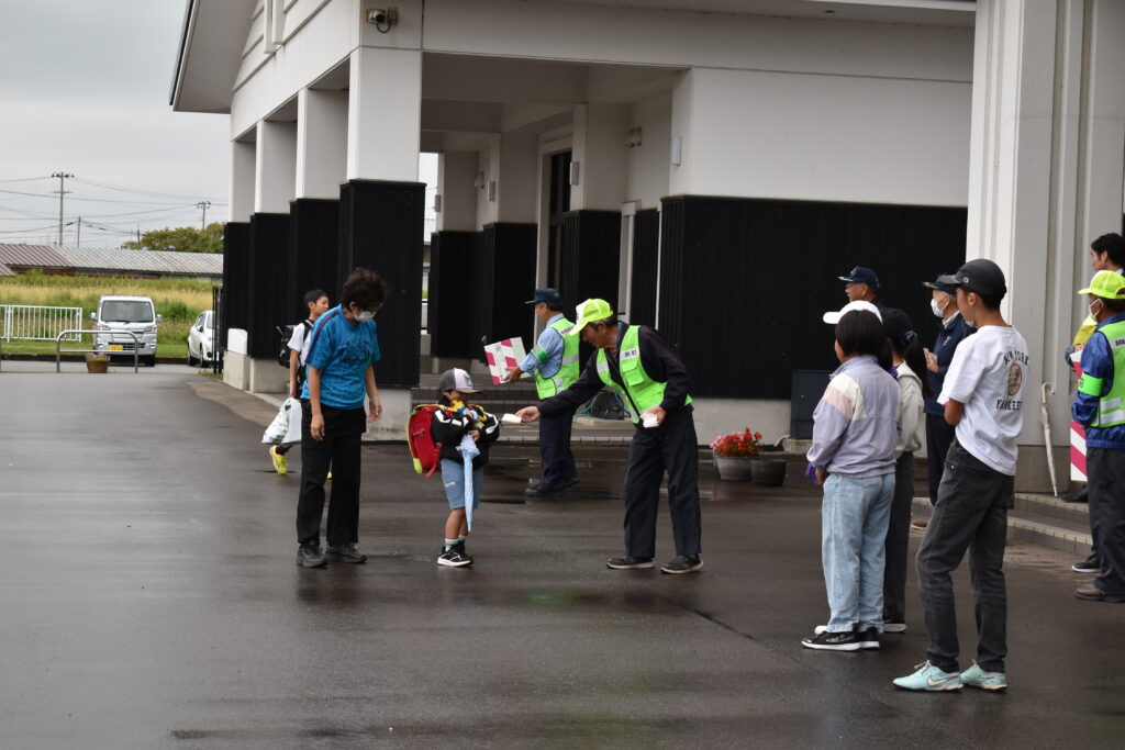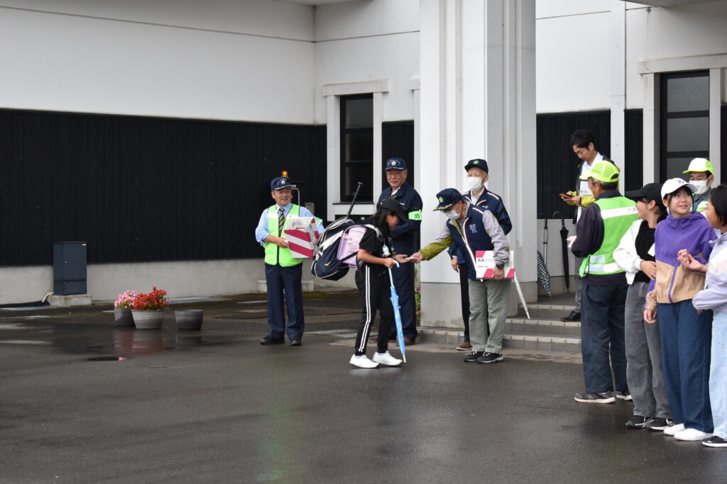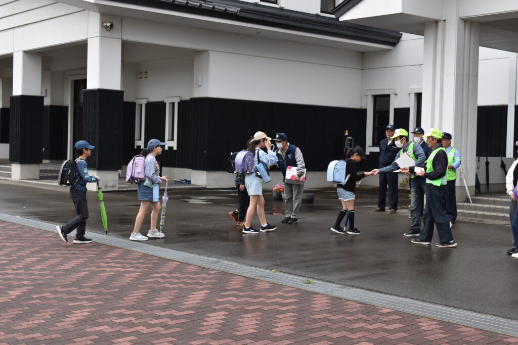 朝、防犯協会の方々が学校にいらして、防犯を呼びかけながら、あいさつ運動をしてくださいました。これに児童会の企画委員の子どもたちも加わり、大きな声であいさつの輪がひろがりました。