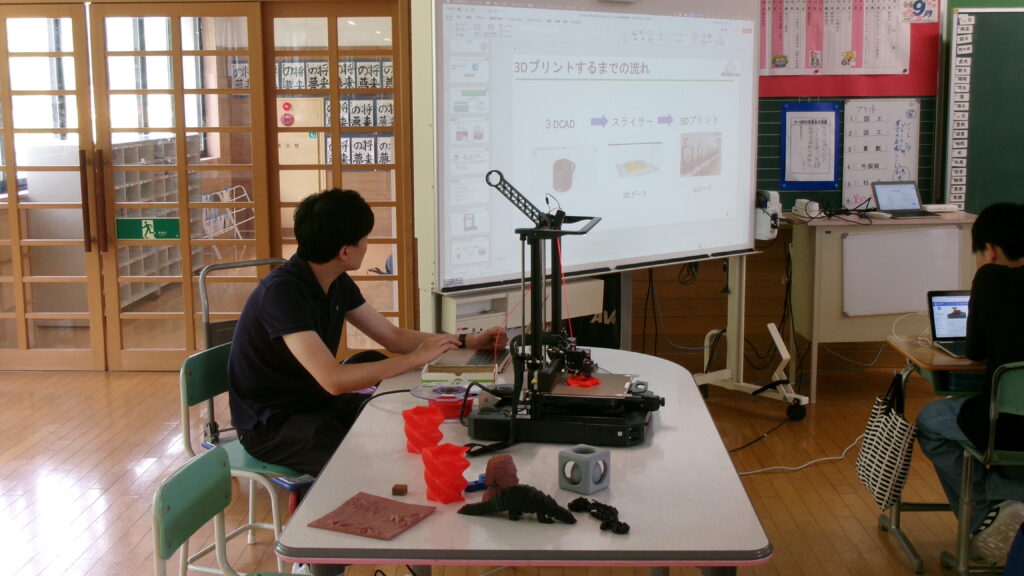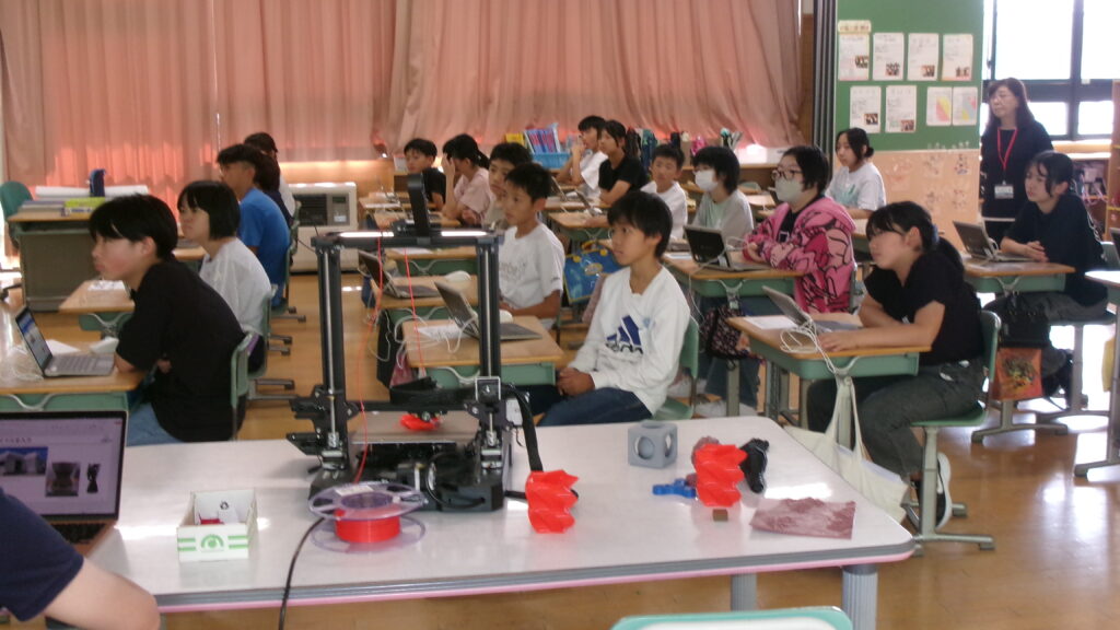今のテクノロジーを実感する「3Dプリンター教室」が行われました。実際に3Dプリンターで作成した作品を目にしつつ、その制作の実際の様子を見せてもらいました。子どもたちが自分で設計したのは自分のネームプレート。後日届けられるそうで楽しみですね。