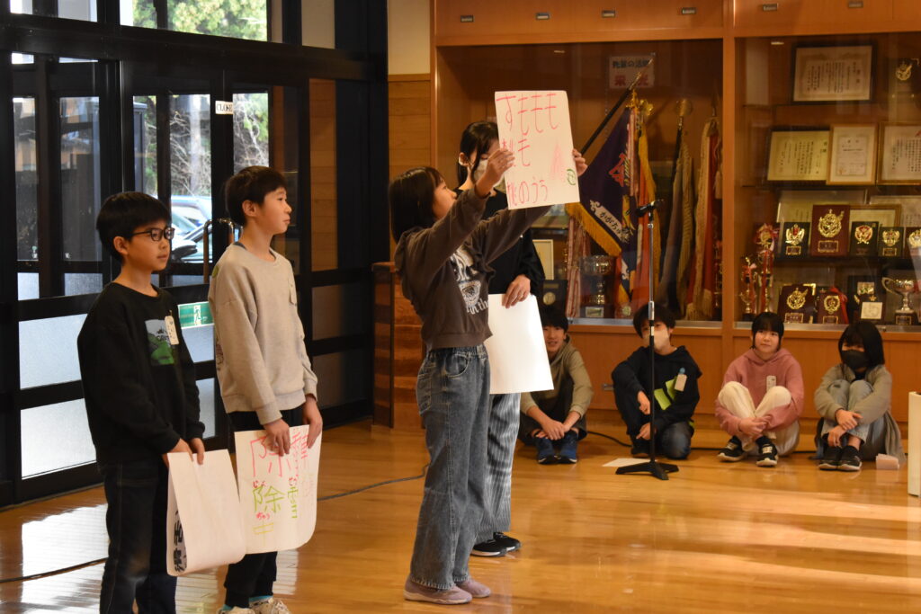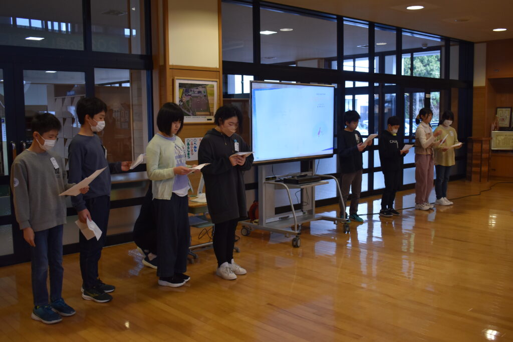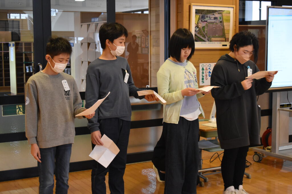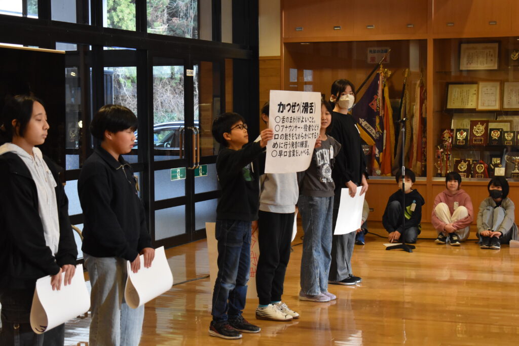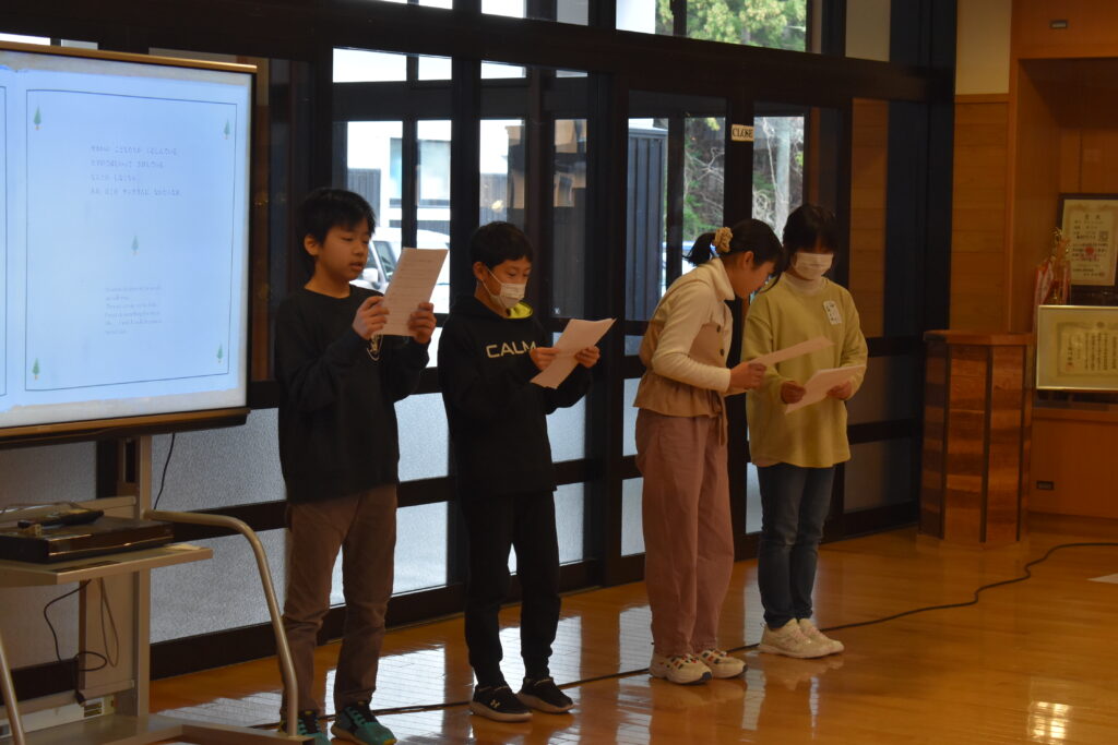 委員会からの発表を全校で楽しむ「児童集会」が行われました。今回の担当は放送委員会と図書委員会です。放送委員会は滑舌をよくするための「早口言葉」を学年毎の課題で挑戦し、図書委員会はクリスマスにちなんだ絵本の読み聞かせをしてくれました。朝の楽しいひとときでした。